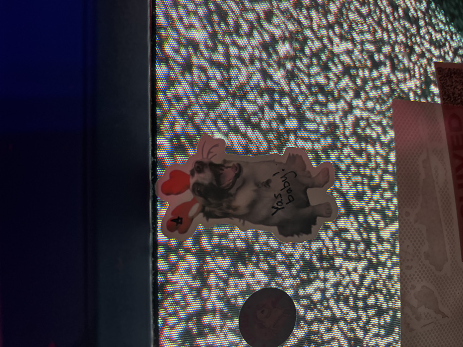 - "The image displays a sticker-decorated screen, possibly a monitor or television, exhibiting a visual static pattern composed of granular, multicolored pixels" by FM-PD7Ls2, licensed under CC BY 4.0