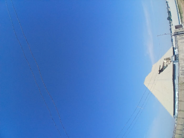 A bright blue sky dominates the image, stretching across most of the frame. Two distinct sets of power lines traverse the scene diagonally. At the right edge, a large, light-colored building is visible with a slightly angular roof. A road and some greenery run along the building's perimeter.