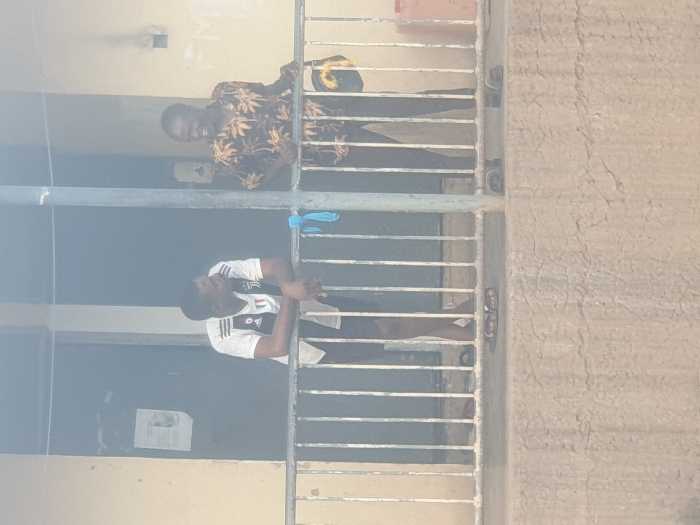 Two men are visible behind a barred gate. The top man is wearing a brown and black patterned shirt and has a dark complexion. The bottom man is wearing a white soccer jersey with black accents and black shorts. Both appear to be outside or on a balcony, as indicated by the external building structure. The area appears to be outdoors on a sunny day.