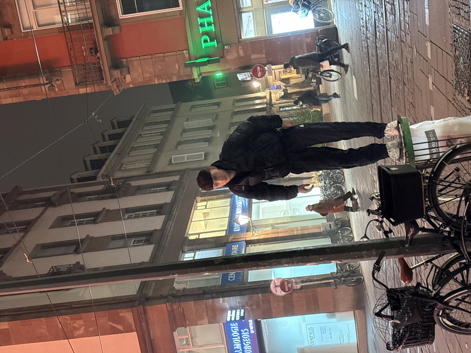 A nighttime scene depicts a young male standing on a public trash can on Rue du Vieux-Marché-aux-Vins in Strasbourg, France. The male, positioned centrally, wears a black puffer jacket, black track pants with white side stripes, and light-colored sneakers, looking directly at the viewer. A dark utility pole stands in the immediate foreground, with two bicycles parked near its base. The street is paved with what appears to be cobblestones and features visible tram tracks. In the background, several multi-story buildings line the street. To the left, a building displays illuminated signs for "OPHTALMOLOGIE BURGEOIS" and "CENTRE DENTAIRE." To the right, another building features a green "PHARMACIE" sign on its ground floor and a red facade on upper levels. Overhead, tram wires are visible against the dark sky. Multiple pedestrians are present in the background, including one individual walking a small dog on a leash to the left of the main subject, and another walking a bicycle on the right. Additional parked bicycles are visible along the street. Red and white circular regulatory signs are also discernible.