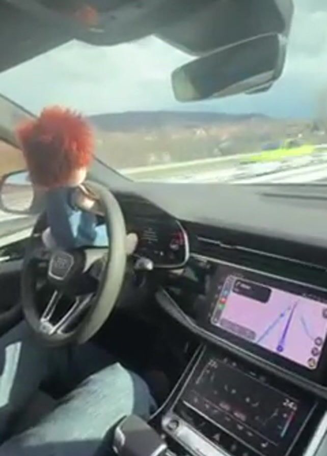 interior of a modern car driving on a highway. An Audi logo is visible on the steering wheel, and the digital dashboard indicates a speed of 140. The car features a navigation system and climate control panel. A red-haired doll sits in the driver's seat, hands appearing to hold the steering wheel. The doll is wearing a blue shirt. A person wearing jeans sits in the driver's seat. The background displays a landscape with hills and a cloudy sky. The road stretches out in front of the car with other vehicles visible in the distance. The camera remains mostly stationary throughout the video.