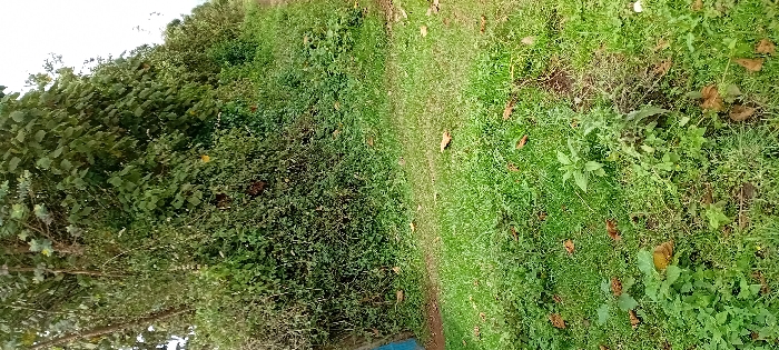 The scene depicts an outdoor, natural environment located in Gatakaine, Kenya. The foreground and midground are covered predominantly by green grass and various low-lying leafy plants, with scattered dried brown leaves visible on the ground. A narrow, unpaved dirt path, approximately 1 to 1.5 meters wide, cuts diagonally across the left side of the frame, extending from the bottom left towards the center-background. Along the entire left side of the image, a dense wall of mixed green foliage is present, consisting of shrubs and taller trees with visible trunks and branches, extending vertically and horizontally across the frame. A small, partially obscured blue structure is visible at the extreme lower-left edge, partially covered by vegetation. The sky, visible in the upper right, appears bright and overcast. No human subjects, animals, or discernible human activity are present in the frame.