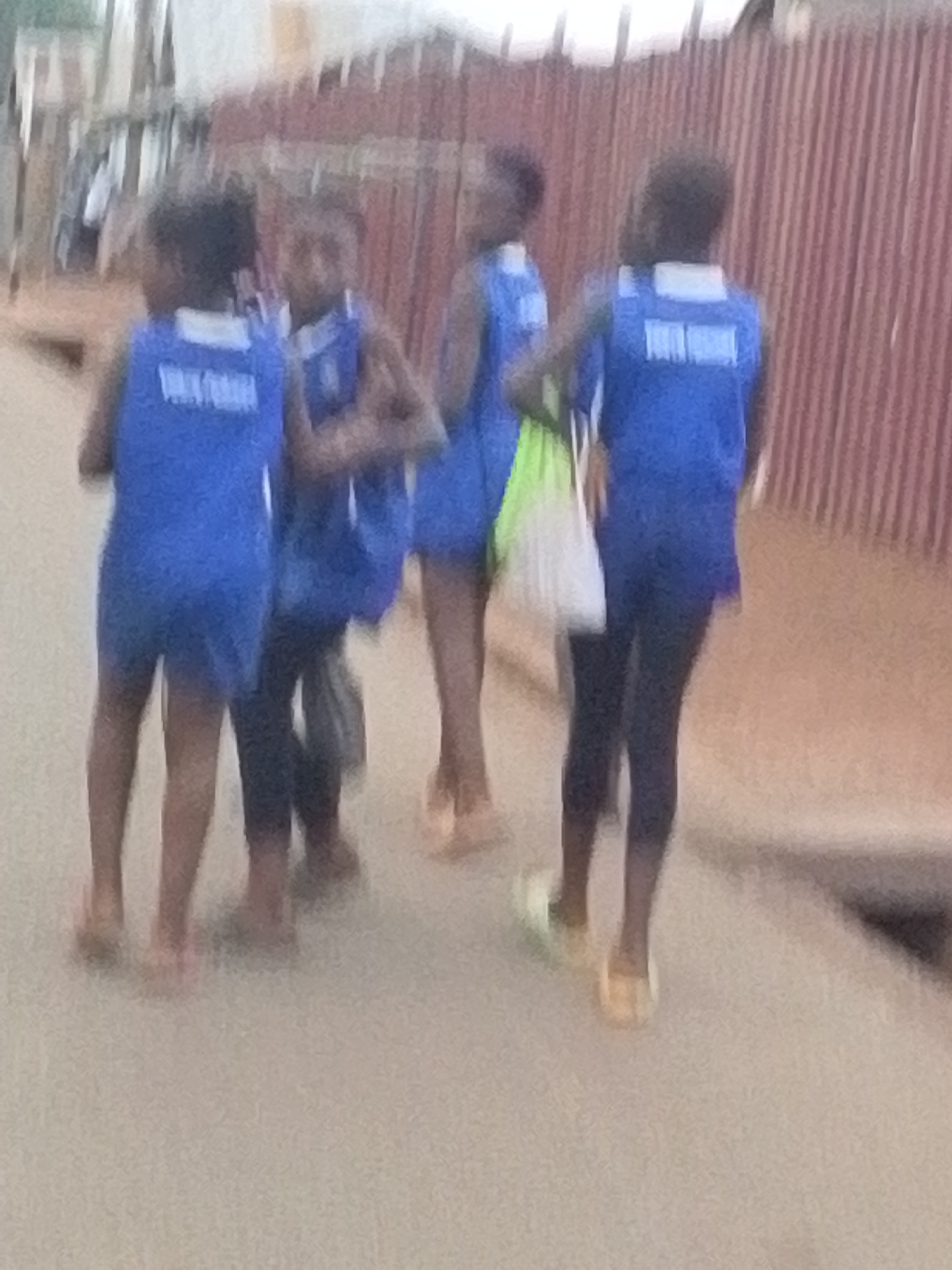 Four children in blue athletic uniforms with the words "YOUTH AMBASSADOR" printed on the back are walking along a street in the city of Tamale, Ghana. The uniforms appear to be shorts and a sleeveless top for two of the children, and leggings and a sleeveless top for the other two. One child is carrying a white and green plastic bag. The street appears to be paved, with some drainage along the edge. A corrugated metal fence is in the background.