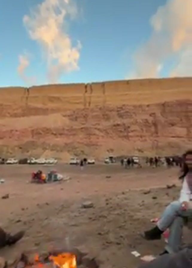 A video shows a group of people gathered outdoors, sitting around a campfire. In the foreground, a campfire burns brightly, surrounded by rocks. A young woman with dark hair, wearing a white sweater and light-colored scarf, sits on a wooden object next to a young man. The man is sitting on the same wooden object and is wearing a dark-colored jacket. They are facing the camera, but only the back of the man's head is visible. In the background, a large, layered rock formation rises, with people and vehicles scattered across the flat ground in front of it. The sky is blue with white clouds tinged with sunlight. The atmosphere appears relaxed and social.