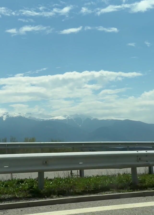 view from a moving vehicle, likely a car, traveling on a highway. A silver guardrail is visible along the right side of the road. Beyond the guardrail, there's grassy vegetation and a view of distant mountains. The mountains are partially covered in snow. The sky above is blue with scattered white clouds. The road itself is asphalt with painted white lines.