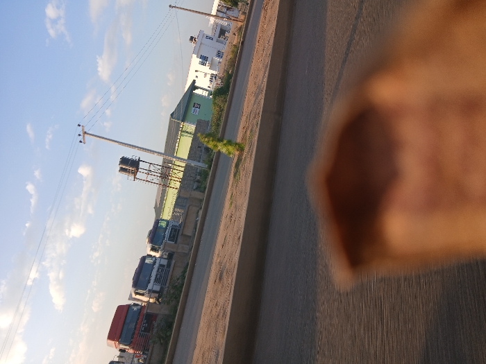 This image captures an outdoor scene in Bukuru, Nigeria, under a partially cloudy, blue sky. The lower portion of the frame is significantly obscured by a blurred, reddish-brown object, consistent with a hand or fabric close to the lens. A paved road extends from the lower-left to the center-right, bordered by a concrete curb and a dirt median strip. A small, thin green plant is visible in the median. Beyond the median, a low concrete barrier separates the road from a commercial or industrial area. Parked behind this barrier are several heavy-duty tractor units: a red truck, followed by two white trucks, and a darker truck. Further back, a tall utility pole with power lines extends upwards. A metal water tower structure with two dark water tanks is visible in the mid-distance. The background features several buildings, including a prominent light green structure with a dark roof and a white multi-story building with a small rooftop water tank. The lighting indicates daylight, with soft shadows suggesting early morning or late afternoon. No individuals are visible.