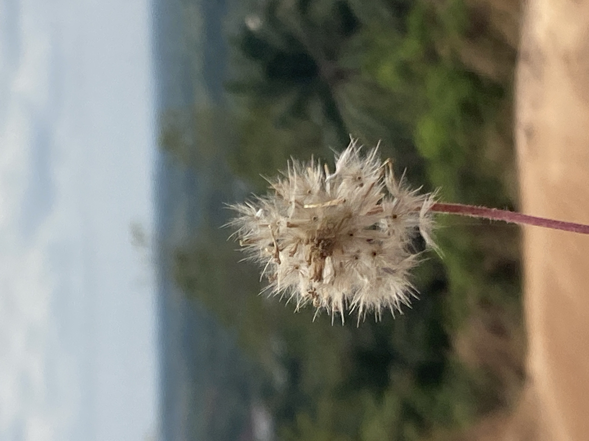 A close-up photograph depicts a mature seed head of a plant, resembling a dandelion, centrally positioned and in sharp focus