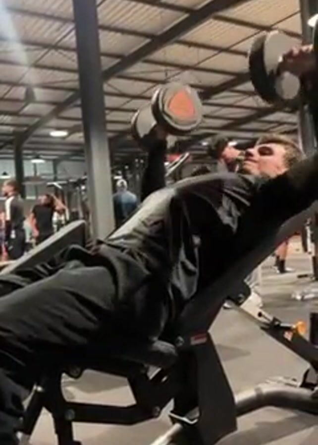man lying on an inclined weight bench in a gym, lifting dumbbells