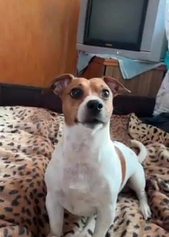 A Jack Russell Terrier stands on a bed covered with a leopard print blanket. The dog has brown and white fur. In the background, there's a wooden cabinet and a silver box television. The dog jumps off the bed and runs out of frame.