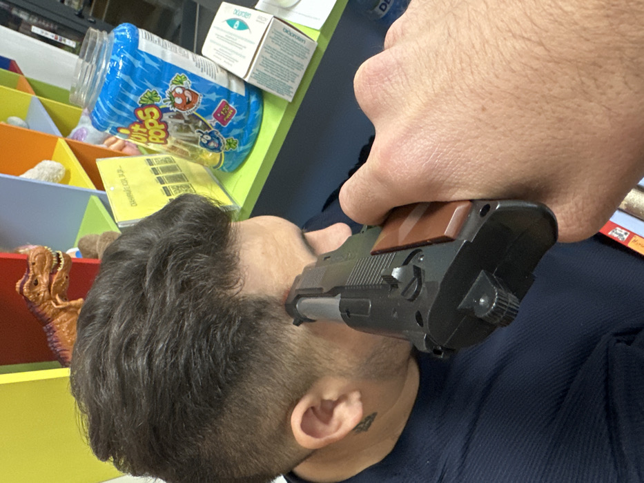 A close-up, high-angle shot depicts a black replica pistol, likely an airsoft or toy gun resembling a Beretta M9/92FS, held by a light-skinned, hairy right hand