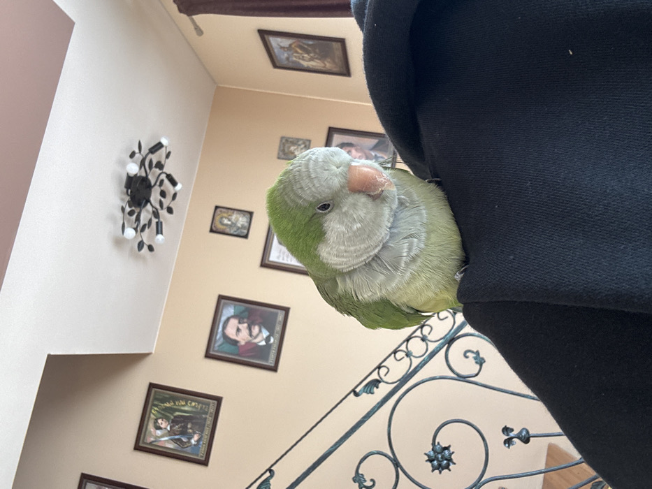 - "A green and gray Monk Parakeet is perched on the left shoulder of an individual wearing a black hooded garment" by FM-WEgZ42, licensed under CC BY 4.0