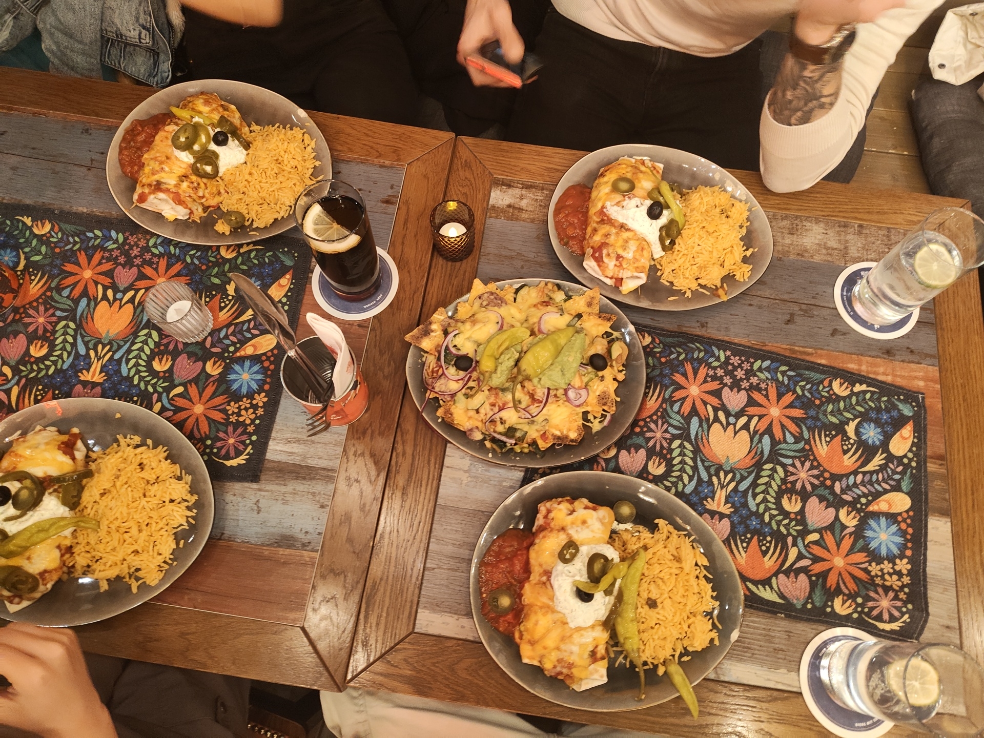 The image displays an overhead view of a dining table within a restaurant in Aschaffenburg, Germany. The specific address or name of the establishment within Aschaffenburg is not identifiable from the visual content. The table surface is composed of distressed wooden planks exhibiting varying tones, including grey, brown, and light blue. Two dark fabric placemats, patterned with vibrant floral and foliage designs in colors such as orange, blue, green, and pink, are laid out. Five plates of food are arranged on the table. Four plates each contain two cheese-covered rolled items, consistent with enchiladas, alongside a mound of yellow rice, a portion of red salsa, a dollop of white cream, sliced green jalapeños, black olives, and whole pickled green peppers. A fifth plate holds a large serving of nachos, topped with melted cheese, red onion rings, black olives, green jalapeños, and a substantial quantity of guacamole. Beverages include two glasses with a dark liquid and a lemon slice, placed on blue and white coasters, and two clear glasses of water, each with a lemon slice, also on similar coasters. Two small, decorative votive candle holders, each containing a lit candle, are positioned on the table, emitting a warm light. A container filled with assorted cutlery and a napkin dispenser are also present. Portions of at least four individuals are visible around the table, indicating a group dining. One person in the upper left wears a blue denim jacket. Another individual in the upper center, wearing black pants and a white t-shirt, holds a red-cased smartphone and exhibits a visible tattoo on their forearm. Hands and arms of other diners are discernible in the lower left and lower right sections of the frame. The scene captures a social dining event.