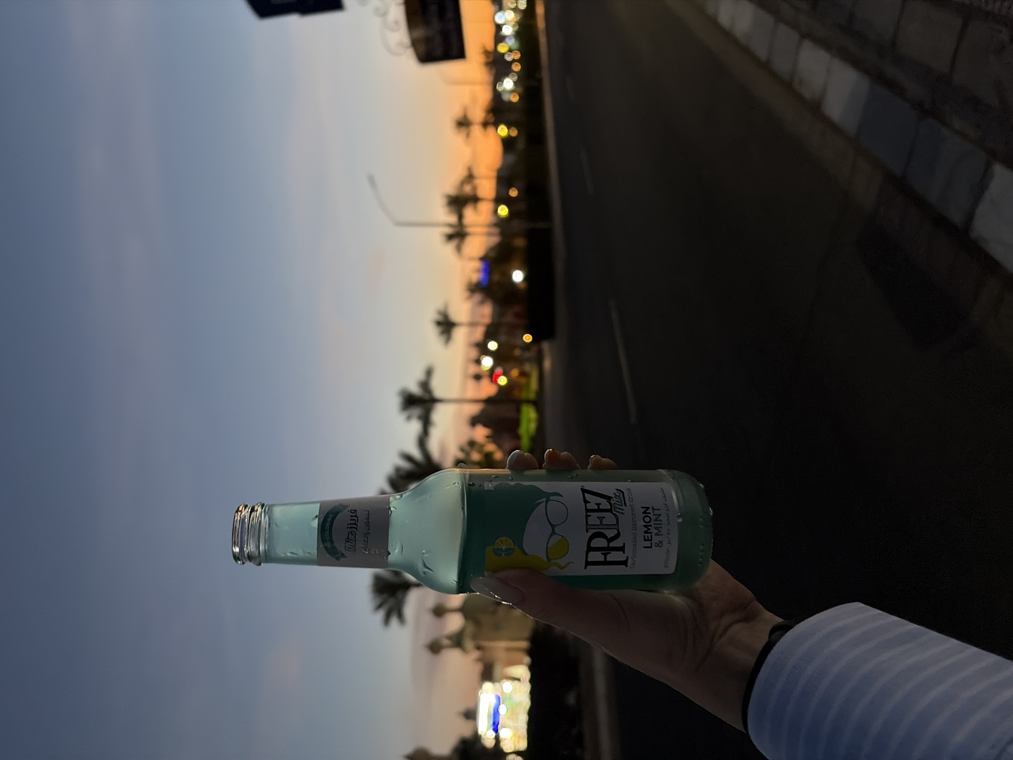 A human left hand, fair-skinned with light-colored manicured nails, holds a chilled, transparent glass bottle containing a light blue-green liquid, visible with condensation. The hand wears a light blue and white striped long-sleeved garment, partially visible at the wrist. The bottle's label displays "FREEZ Mix Lemon & Mint," identifying it as a carbonated flavored drink, with an illustration of a figure in sunglasses and a lemon. The scene is set outdoors at dusk in Sharm El Sheikh, Egypt, under a sky transitioning from blue to orange and yellow near the horizon. In the blurred background, a dark, paved road runs horizontally, bordered by a curb of alternating light and dark blocks on the right. Multiple palm trees are silhouetted against the sunset. Various blurred artificial lights, including streetlights and building illuminations, are visible along the road, with a distinct red light present on the left. To the far left, an indistinct ornate building with dome-like structures, consistent with local architecture, is partially visible and illuminated.