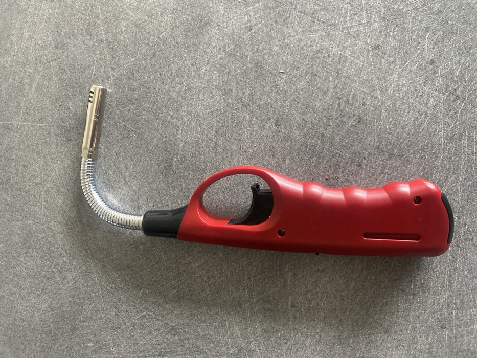 A single red utility lighter is depicted resting on a textured, light-grey surface in Oberhausbergen, France. The lighter features a red plastic handle with a distinct pistol-grip design, including finger grooves. A black trigger mechanism is located within a circular guard. Extending from the top of the handle is a flexible, corrugated metallic neck, which bends in an arc towards the upper right of the frame. This neck terminates in a rigid, silver-colored metallic nozzle with three rectangular apertures visible on its upper surface. The underlying grey surface displays numerous fine, linear scratches and scattered specks across its entirety. No people, actions, or interactions are visible.