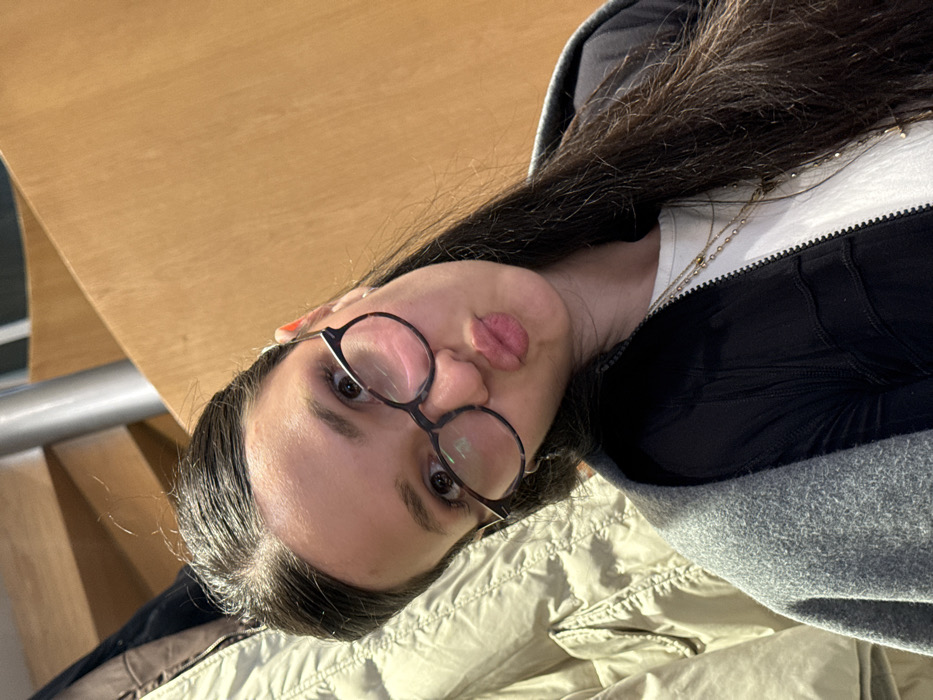 A young woman with long, dark hair and glasses poses for a selfie. She puckers her lips towards the camera. She wears a white top underneath a black jacket and a gray hoodie. A gold necklace is visible. The background consists of a light brown wooden surface and a tan, puffy jacket. The image is rotated slightly counter-clockwise.