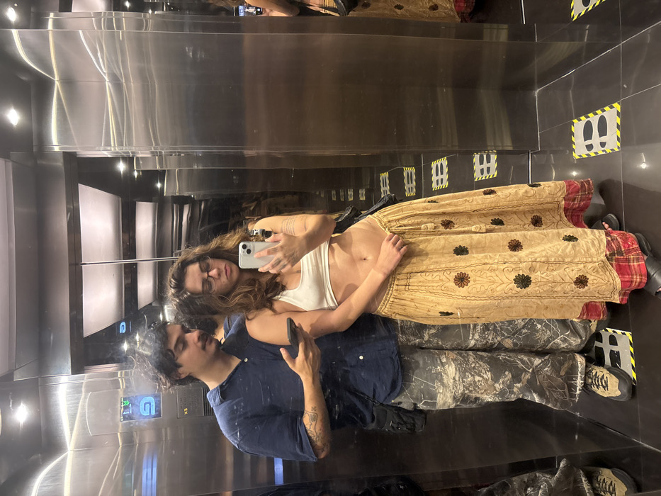 The image displays two individuals, a male and a female, inside a reflective elevator, captured via a mirror selfie