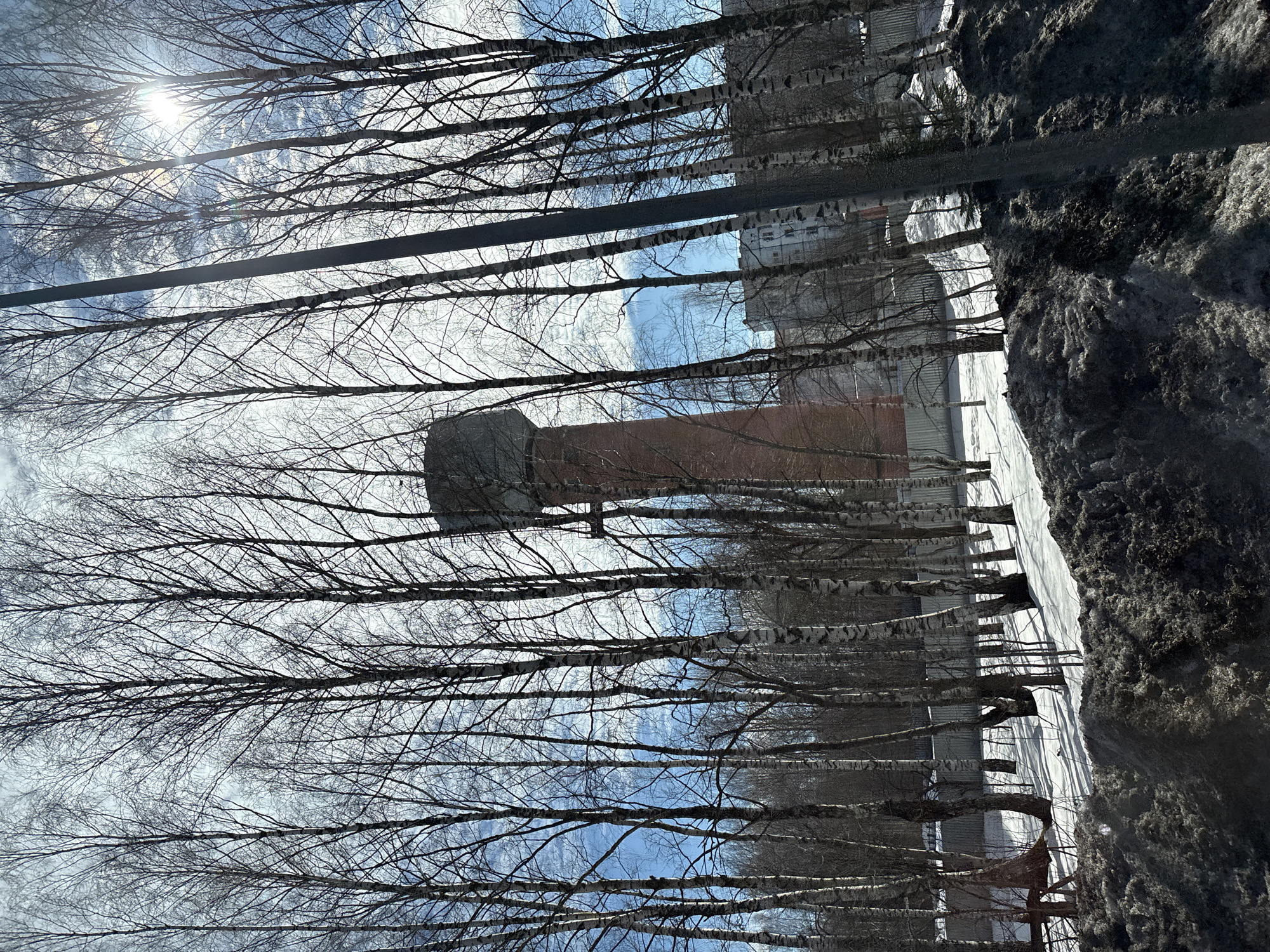 The image depicts an outdoor urban landscape in Italmas, Russia, under a partly cloudy sky with visible sunlight causing lens flare in the upper right. Dominating the scene are numerous tall, bare deciduous trees, primarily birches with characteristic white and dark bark, which frame the view and partially obscure background elements. In the left background, a prominent, tall, cylindrical water tower with a red brick shaft and a dark, cylindrical tank structure atop it is visible. To the right of the water tower, further in the background and partially obscured by trees, are several multi-story, light-colored residential buildings. The ground is covered with snow. The immediate foreground features a substantial, dark, dirty snowdrift, likely accumulated from plowing or snowmelt. Further back, the snow is cleaner, displaying distinct shadows cast by the trees. A light-colored, corrugated metal fence runs horizontally across the mid-ground, separating the snowy area from a more distant tree line. A dark, vertical pole, possibly a utility or light pole, extends upwards in the right mid-foreground, partially obscuring the trees and sky. No individuals, overt actions, or interactions are observable within the scene.