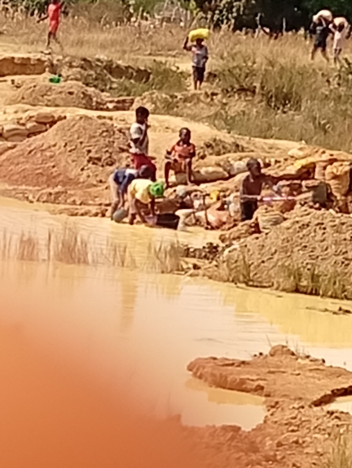 The image depicts an outdoor scene in Unknown, Unknown, featuring approximately nine individuals engaged in manual labor around a body of murky water and disturbed reddish-brown earth under bright daylight