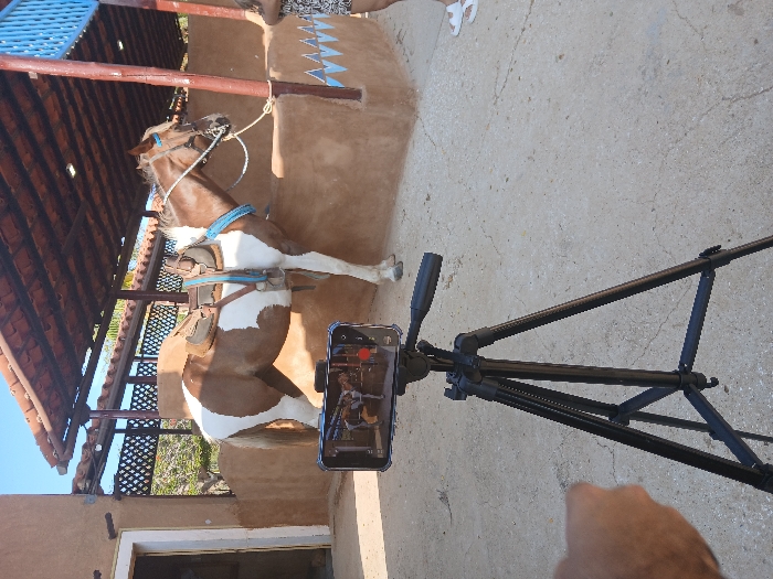 The scene is an outdoor animal enclosure in Guayacancito, Venezuela, under clear daylight conditions. A brown and white pinto horse, outfitted with a light brown saddle and light blue bridle, stands tethered by a light blue rope to an earth-toned wall structure. The horse is positioned beneath a red-tiled roof supported by dark brown wooden posts; one post features a light blue and white triangular pattern. The ground is paved with concrete. In the foreground, a black smartphone is mounted horizontally on a black tripod, actively displaying a video recording interface with a live feed showing two individuals interacting with what appears to be another horse. A red "REC" indicator is visible on the phone screen. A human hand is partially visible in the lower-left, pointing towards the tripod. On the far right, the lower torso and legs of a person wearing a black and white patterned garment and white sandals are partially visible. Green foliage and a clear blue sky are visible in the background.