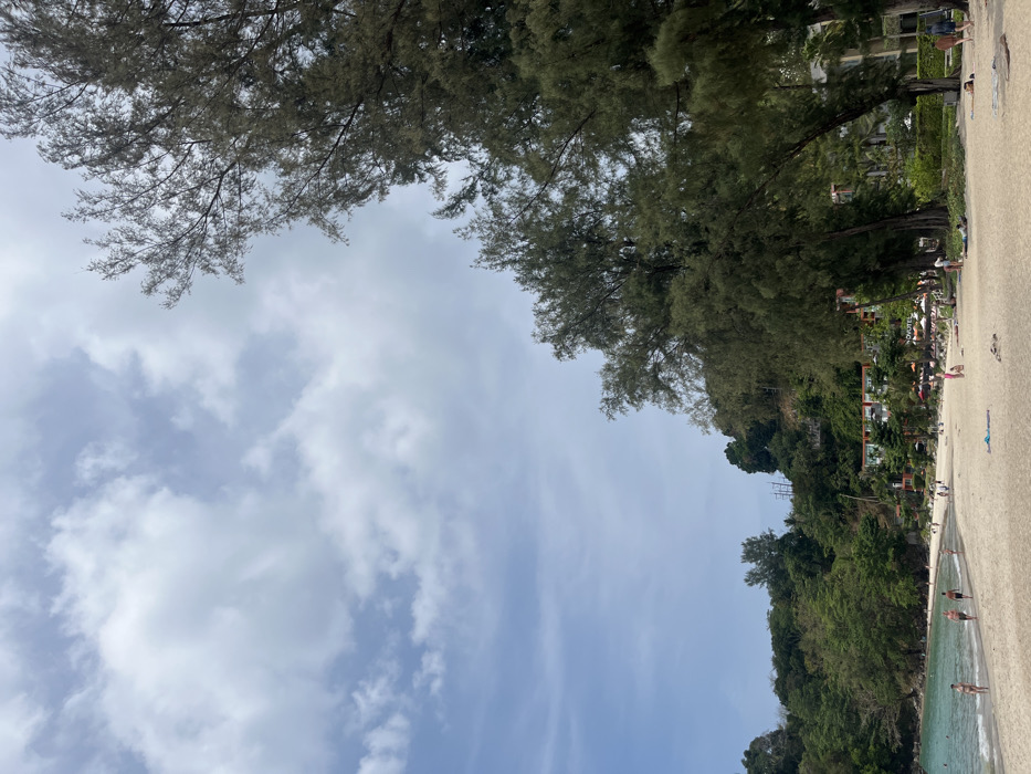 The image captures a beach scene with trees framing the sky. Sandy beach stretches along the right edge, dotted with people enjoying the shoreline. Lush green foliage covers a hillside adjacent to the beach, with glimpses of buildings nestled within the trees. Above, the sky is filled with a mix of blue and white clouds, providing a backdrop for the overhanging branches of the trees.