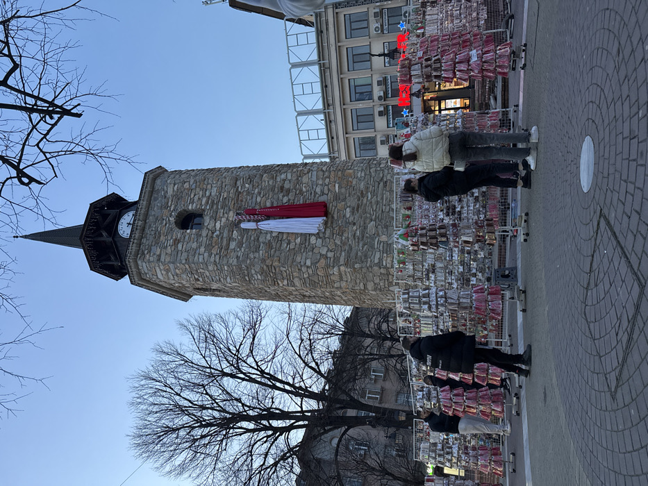 The image depicts a public square in Haskovo, Bulgaria, centered around the stone-built Haskovo Clock Tower. The tower features a dark, pointed spire, a visible clock face showing approximately 1:00, and an arched window. Two large, vertical decorative elements, one white and one red, are suspended from the tower's facade below the belfry, which is adorned with festive lighting. In the midground, multiple temporary market stalls, constructed of metal racking, display a dense arrangement of small, packaged items, primarily in red, white, and pink. Several of these displays are tiered, pyramid-like structures. Six individuals are present in this area, observing or browsing the merchandise. One male wears a dark puffer jacket and stands with his back to the viewer. Another female, also facing away, wears a light-colored puffer jacket. Other individuals are partially visible at various stalls. The foreground consists of a paved pedestrian area with distinct circular brick patterns and a square utility cover. The background to the left of the tower includes bare deciduous trees and multi-story buildings. To the right, a commercial building with large windows, exterior air conditioning units, and a partially visible illuminated sign reading "NEW YORKER" is visible. The sky is clear and light blue, indicating either dawn or dusk.