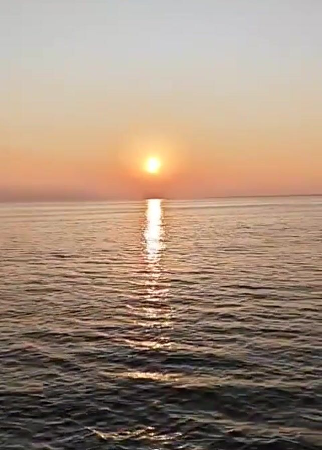 sunrise over the ocean. The sun is a bright orange orb low on the horizon, reflecting a path of light across the water. The sky graduates from a light blue at the top to a pale orange near the horizon. The water has small waves. Some dark objects can be seen in the lower left, likely rocks or part of a shoreline. The camera is steady.