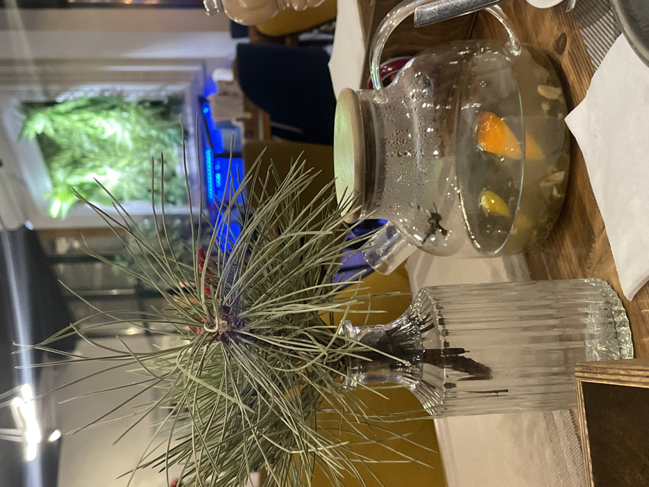 The image depicts an indoor scene within a commercial dining establishment in Anapa, Russia. In the immediate foreground, positioned on a light-colored fabric runner over a wooden table, are two central objects. To the left, a clear, vertically ribbed glass vase contains a bouquet of green pine needles, sparsely decorated with small red berries. To the right, a clear glass teapot with a light wooden lid holds a brewed beverage. The beverage contains visible slices of orange and lemon, along with settled particulate matter consistent with tea leaves or herbs. Condensation is present on the interior surface of the teapot. A white folded napkin and a metallic utensil handle are partially visible to the right of the teapot, while a section of a wooden container is visible to its left. The background, blurred, shows additional dining tables and chairs, including yellow and dark blue seating. A vertical green wall feature, brightly lit, is visible in the upper right background, with a horizontal blue illuminated element beneath it. Overhead lighting fixtures are discernible. No individuals are present in the frame.