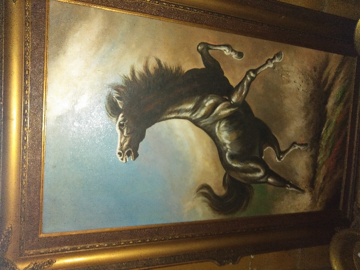 This image presents a photograph of a framed oil painting. The central subject of the painting is a dark-coated equine, likely a horse, rendered in a dramatic rearing posture. The horse's body is dark brown to black, with visible musculature, and its head is thrown back with its mouth agape, suggesting a whinny or roar. Its mane and tail are depicted as dark and flowing dynamically, indicative of motion. The horse's front legs are elevated, while its hind legs appear planted on the ground. The background of the painting features a sky that transitions from a light blue at the upper left to a hazy, yellowish-white cloud formation with areas of brown and orange towards the upper right, suggesting a dramatic or stormy atmosphere. The lower portion of the painting portrays uneven, earthy terrain with suggestions of green and brown foliage, implying an outdoor landscape. The painting is enclosed within a thick, ornate wooden frame with a distressed gold finish, featuring decorative carvings or moldings along its inner and outer edges. The photograph itself shows some glare on the painting's surface and appears to be taken from a slightly upward angle, capturing part of the frame's depth. Location: Longmiang, Laos.
