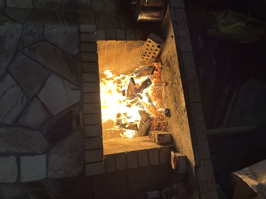 The image depicts an active outdoor fireplace or barbecue structure at night in Rakitovo, Bulgaria