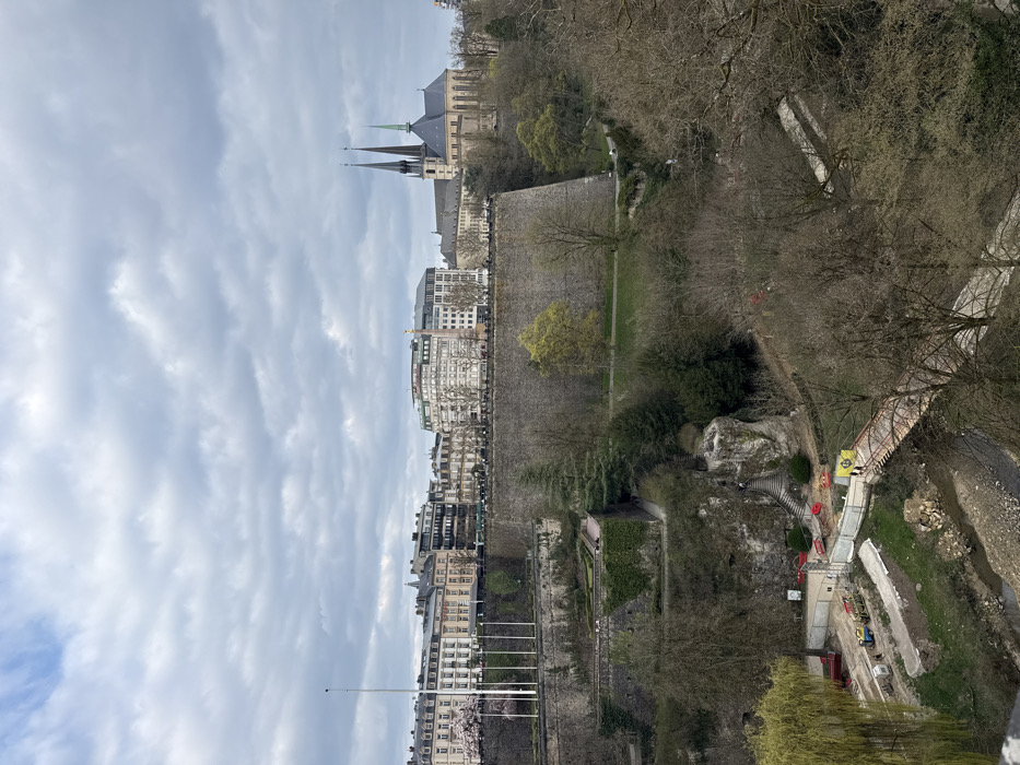 The image displays a panoramic view of Luxembourg City, Luxembourg, specifically overlooking the Pétrusse Valley from an elevated position, likely near Chemin de la Corniche or the Cité Judiciaire, towards the upper city plateau. The scene is divided into three distinct vertical layers under an overcast sky. The uppermost layer, forming the skyline, features a dense urban environment. Prominently, the twin spires of the Notre-Dame Cathedral rise on the right. To its left, a cluster of multi-story buildings, including both historical and modern architectural styles, line a street. A tall, slender monument, identifiable as the Gëlle Fra (Monument of Remembrance), stands amidst these buildings. Several white flagpoles, devoid of flags, are visible on the far left. Pedestrians and vehicles are discernible on the streets. The middle layer consists of the city's robust stone fortifications, forming a large retaining wall that supports the upper city plateau. Below these walls, terraced green spaces, pathways, and mature trees are integrated into the historical structures. A formal garden with manicured hedges is visible within one of the lower terraces of the fortifications. The lowest layer depicts the Pétrusse Valley floor. A narrow stream or river, likely the Pétrusse, meanders through the valley. Extensive construction activity is underway near the stream, characterized by earthworks, construction barriers, scaffolding, and yellow machinery. A pedestrian bridge or temporary walkway, reddish-brown in color, spans the stream, with a few individuals traversing it. Rocky outcrops and dense, deciduous trees, mostly bare indicating late winter or early spring, populate the valley floor and slopes. A weeping willow with green foliage is visible on the far left. Overall, the environment transitions from dense urban development to historical fortifications, then to a natural valley undergoing development.