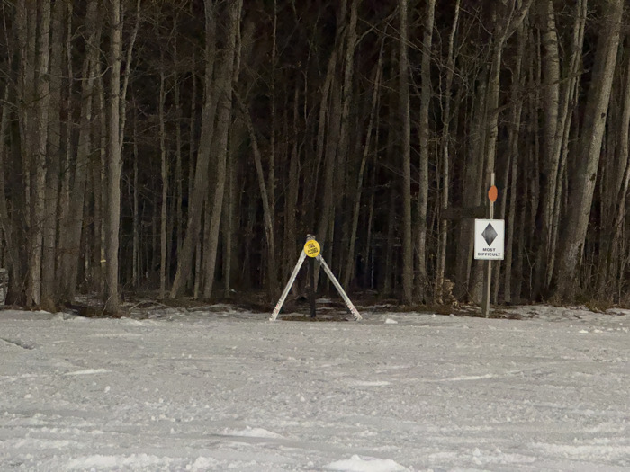 A snowy landscape at night with a dark forest as a backdrop. In the foreground, a trail closure sign is supported by white poles. To the right, a black diamond "most difficult" sign is visible. The ground is covered in snow with faint ski tracks. The forest consists of tall, bare trees, creating a stark contrast to the white snow.