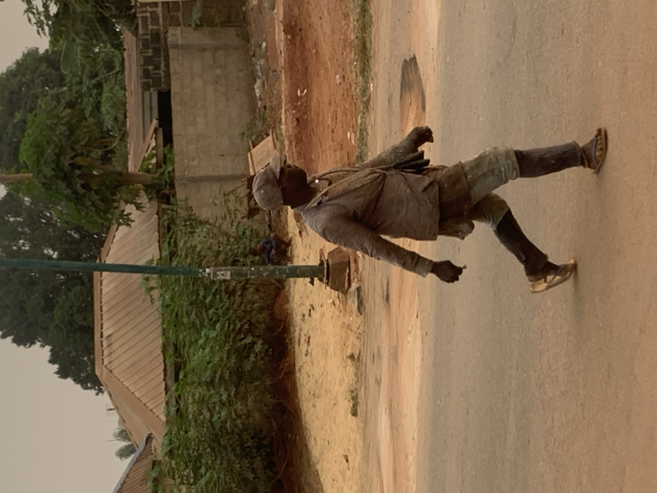 A man walks along a road in a rural setting. He wears dark clothing, including long sleeves, shorts, long socks, and shoes. A hat covers his head, and a bag hangs over his shoulder. In one hand, he holds a small, dark object. The road is paved, and buildings of brick and corrugated iron stand to the side, half-hidden by trees. A green metal pole stands near the edge of the road. A small child squats beside the pole.