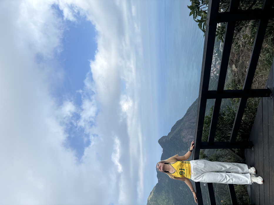 A young woman in a yellow tank top and gray sweatpants stands on a wooden deck with a black railing. Behind her, a mountain landscape merges with a cloudy sky. In the background, the ocean fades into the horizon. The woman appears to be enjoying the view.