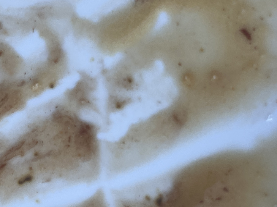 The image presents a close-up, abstract view of a predominantly light-colored, smooth surface, likely white or off-white. This surface is extensively covered with irregular, organic patterns of a viscous, yellowish-brown substance. The substance exhibits varying densities, forming streaks, smears, and mottled patches, with distinct lighter areas of the underlying surface visible. Embedded within the yellowish-brown residue are numerous small, dark reddish-brown particles and some small, spherical bubbles. The texture suggests a liquid or semi-liquid material that has been spread, dried, or partially cleaned from the surface. No discernible people, specific objects beyond the residue and surface, actions, or interactions are visible. The immediate environment is limited to the stained surface, offering no broader context. The image contains no visual information to determine its geographical location, including any specific location within Barcelos, Portugal.