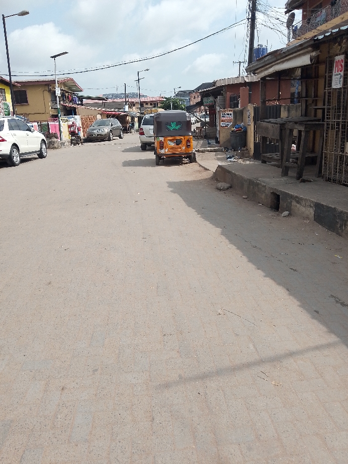 This image displays a daytime street scene in Agani, Nigeria