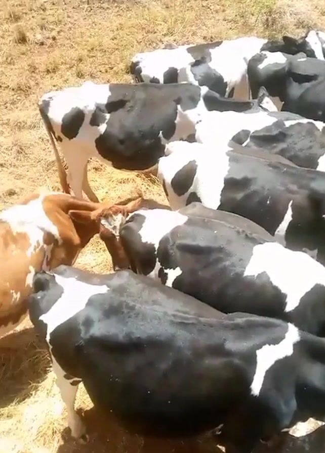 group of cows drinking water from a trough. The cows are mostly black and white, but there is one brown and white cow among them. The cows are crowded around the trough, and some are pushing each other to get a better spot. The environment is dry with yellowed grass. There are some trees in the background. The video appears to have been taken during the day.