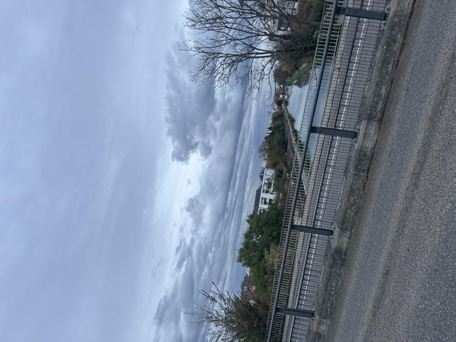 The image depicts an overcast urban landscape in Hoenheim, France, observed from a bridge or overpass. A dark asphalt road surface occupies the lower left quadrant. A grey metal railing, consisting of vertical posts supporting multiple horizontal bars, traverses the mid-ground, separating the viewpoint from the scene below. Below the railing, a paved path or service road with two parallel white lines runs adjacent to a canal. The canal, featuring calm, dark water, extends from the mid-ground into the distance, narrowing with perspective. The canal's left bank is lined with dense green and autumnal deciduous trees and shrubs. Beyond this vegetation, several multi-story residential buildings with light-colored facades and dark roofs are visible. The right bank of the canal also features trees, including a prominent large deciduous tree with bare branches in the right mid-ground. Further along the right bank, additional buildings are discernible. The sky above is entirely covered by layered, heavy grey clouds, indicating an overcast condition. No individuals, vehicles, or animals are visible within the frame.