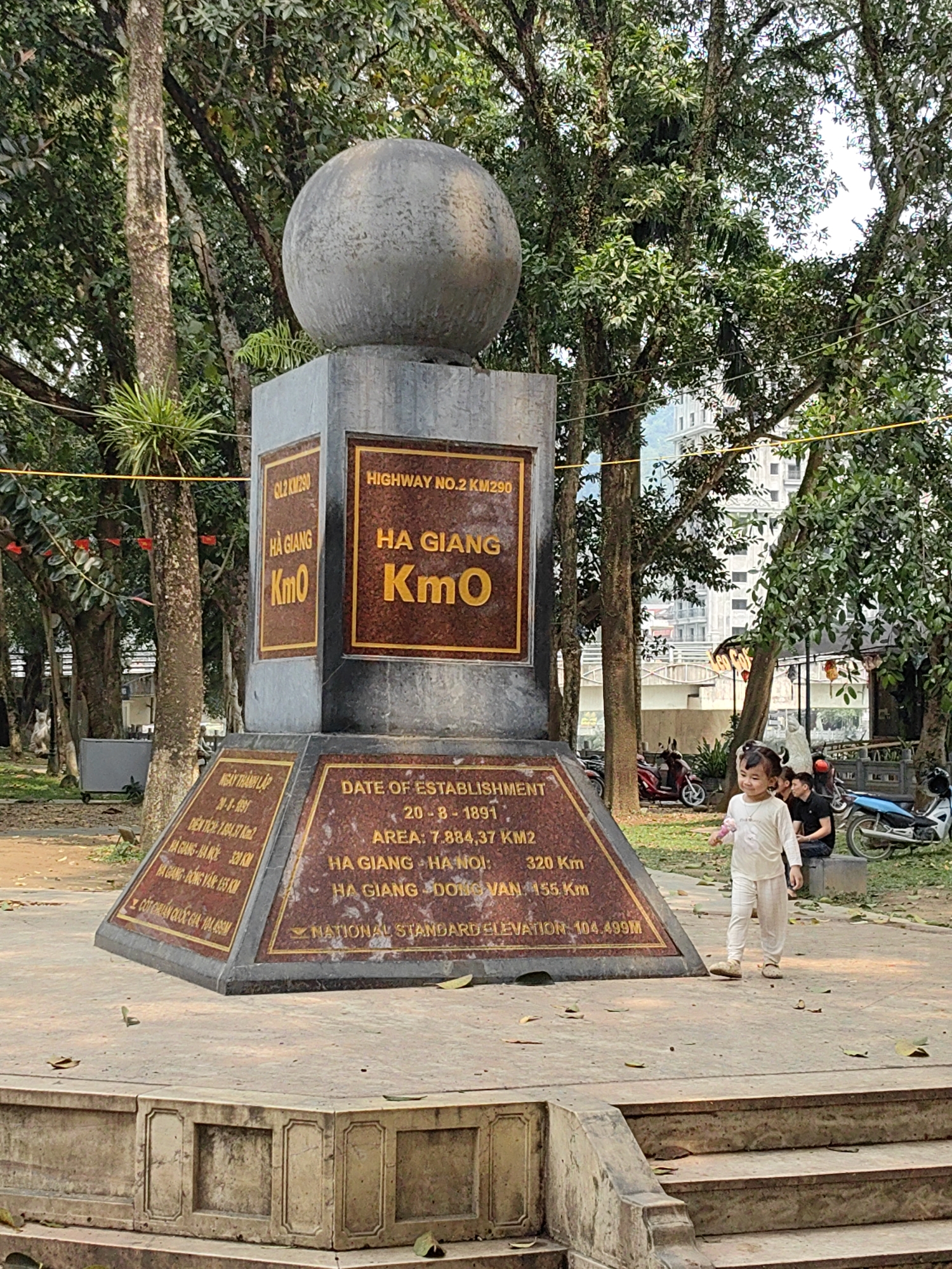 Captured on an overcast day in Thành phố Hà Giang, Vietnam, the photograph showcases a historical marker topped with a sphere, situated in a park-like setting. The marker, constructed of stone with red-brown panels and gold lettering, displays historical facts including "Highway No. 2 KM290," "Ha Giang Km0," and establishment date. A young child in light-colored clothing is walking in front of the monument. In the background, two individuals are seated, and several scooters are parked nearby. Trees surround the area, with a building visible in the distance. The marker sits on a concrete base, accessible by short steps.