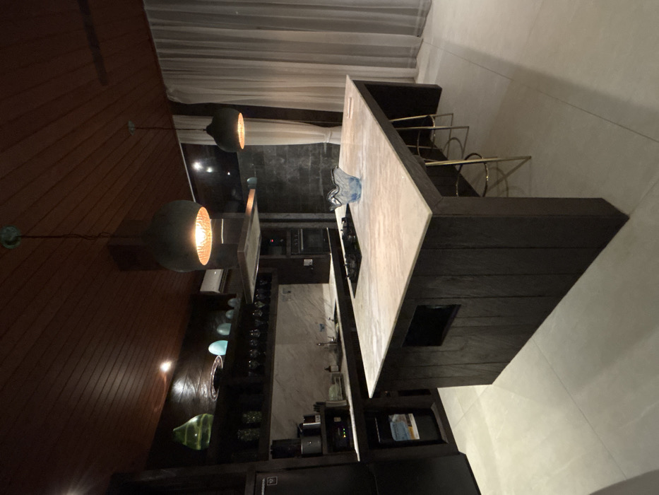The image depicts a modern, unoccupied kitchen interior located in Batuan, Indonesia. The space features a dark wooden plank ceiling and dark wooden cabinetry throughout. A prominent central kitchen island with a light-colored marble countertop houses an integrated black four-burner gas stovetop. A light blue, wavy glass bowl and two small white rectangular objects are present on the island's surface. Three gold-finished metal bar stools with circular seats are tucked under the far side of the island. A rectangular recess is visible on the near side of the island's base. Overhead, three dark, bell-shaped pendant lights with illuminated warm-toned inner surfaces hang from the ceiling, with two positioned directly above the island. A dark-paneled range hood with a metallic underside extends from the ceiling above the stovetop. The back wall features a light-colored marble backsplash above dark wooden base cabinetry. A double sink with dark fixtures is visible. Various small appliances, including a coffee maker and toaster, are situated on the counter. Open dark wooden shelving above the main counter displays assorted glassware (wine glasses, tumblers) and decorative objects, including a large green wavy glass piece and several smaller teal-blue glass items. To the left, a built-in black refrigerator and an integrated small beverage cooler are part of the cabinetry. On the far right, built-in oven units are visible. The right wall features a large window covered by sheer, floor-length white curtains. The floor is composed of large, light-toned square tiles. No individuals or active processes are present.