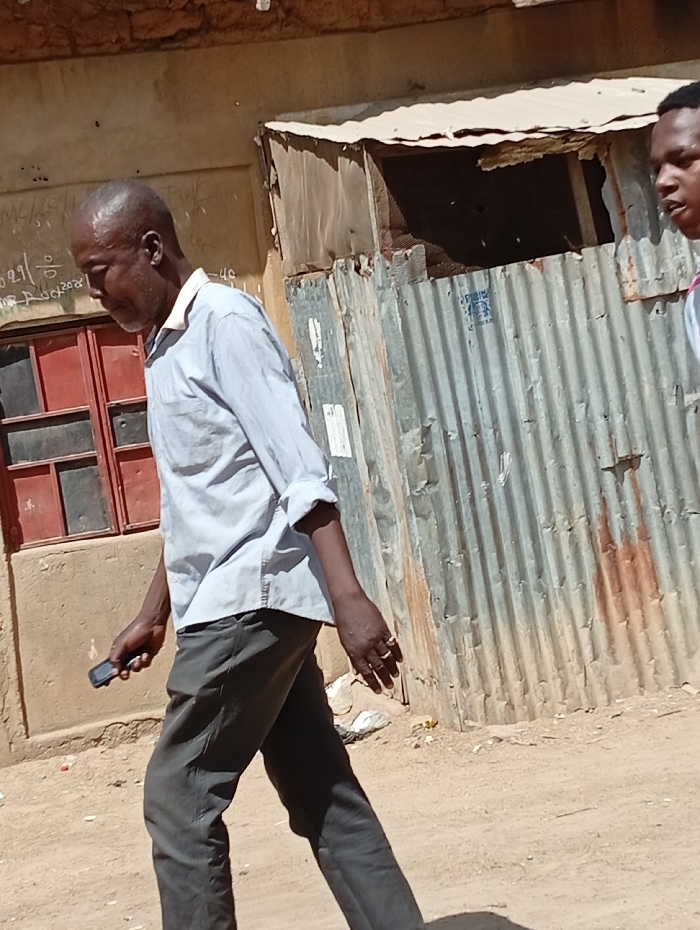 The image depicts an outdoor street scene in Gwagwarwa, Nigeria, under direct sunlight, evidenced by prominent shadows. Two individuals are present. The primary subject, a dark-skinned adult male with a bald or closely shaved head and a beard, walks from left to right in the foreground. He wears a light blue or grey long-sleeved shirt with rolled-up sleeves and dark trousers. He holds a dark-colored mobile phone in his left hand, and his right hand bears two rings on the ring finger. He is looking downwards. Partially visible on the right, a second dark-skinned male with short dark hair is oriented towards the left, with only his upper right profile and shoulder discernible. The background features two structures. To the left, a building constructed of light brown material (possibly mud or plaster) has a red-framed window with multiple panes. Graffiti-like markings, including what appears to be "2021," are visible on its wall. To the right, a weathered structure made of corrugated metal sheets, exhibiting rust and reddish-brown discoloration, features an open window or aperture covered by a mesh screen, topped with a flat corrugated metal awning. The ground is dry, light-colored dirt with scattered small debris.