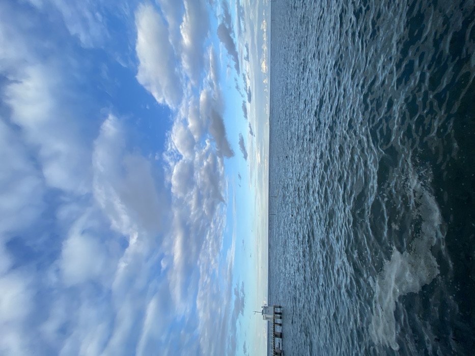 A wide-angle, static image captures a maritime scene along the Veracruz City coastline in Mexico. The foreground and midground feature the surface of a body of water, likely the Gulf of Mexico, characterized by dark blue-green tones and a rippled texture from small waves. A distinct, irregular patch of light-colored, frothy material floats on the water's surface in the bottom-left quadrant. On the far left, a light-colored pier extends partially into the water, culminating in a small, white, enclosed structure with a dark, sloped roof and a slender mast projecting vertically from its top. This structure appears to be a navigational aid or a monitoring station. Multiple thin, dark, vertical poles are visible protruding from the water across the middle distance, suggesting markers or supports for submerged infrastructure. The sky, occupying the upper portion of the frame, is a vibrant blue interspersed with numerous white and grey cumulus clouds of varying sizes and densities. The horizon line is flat and extends across the entire image. No human subjects or active vessels are visible.