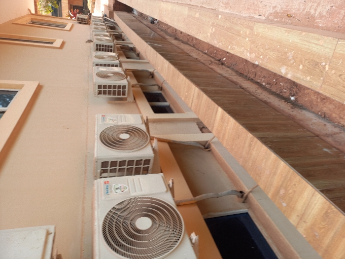 The image depicts the exterior wall of a building in Oturkpo, Nigeria, featuring a linear arrangement of approximately ten to twelve white outdoor air conditioning condenser units mounted above a series of rectangular windows. The building wall is painted a light cream color, and the windows have white frames. Beneath the air conditioning units and windows, a low, tiled barrier or planter box extends horizontally, clad in light brown wood-grain tiles. Adjacent to this barrier, a narrow trench filled with reddish-brown earth and minor debris runs parallel to the building. Electrical conduits and refrigerant lines are visible connecting the air conditioning units to the building wall. No individuals are present in the scene. The overall lighting suggests daylight conditions.