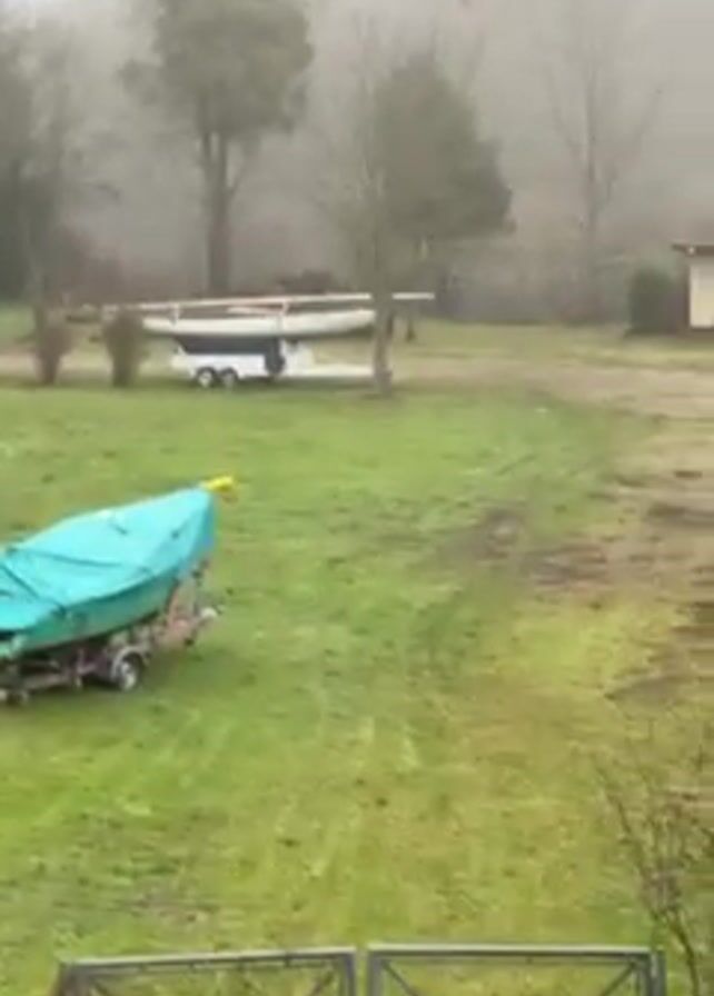 The camera pans across a grassy area in misty weather. In the foreground, a boat covered with a green tarp sits on a trailer. Another boat, also on a trailer, is further away. Small buildings and trees are visible through the fog. The ground shows patches of mud. In the lower part of the frame, there is a metal fence. The camera pans to the right, showing a lifting rig and various storage sheds.