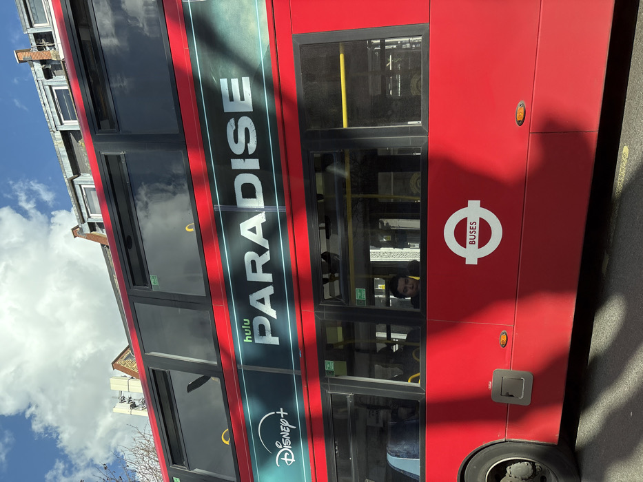 A red double-decker bus, identifiable as a public transport vehicle from London, United Kingdom, is observed on an urban street under a partially cloudy blue sky. The bus's exterior features a large advertisement for "Disney+" and "hulu PARADISE" on its side, along with the Transport for London "BUSES" roundel logo. Strong, elongated diagonal shadows are cast across the bus's red body and onto the dark asphalt road surface, indicating direct sunlight. Through a lower-deck window, a single individual, a young adult male with dark hair, is visible looking forward. Above the bus, a multi-story building with a dark tiled roof, multiple dormer windows, and several chimney pots is partially visible, with what appears to be communication antennae mounted on the rooftop.