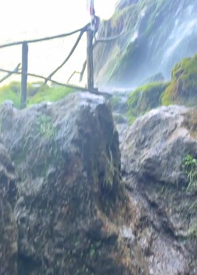 waterfall cascading down a rocky, moss-covered cliff. The camera pans upward from a cluster of large rocks to reveal the top of the waterfall against a clear blue sky. Mist rises from the base of the falls, creating a hazy effect. A weathered wooden fence sits to the left, and green grass is visible on the hillside behind the waterfall. Tree branches overhang the top of the cliff.