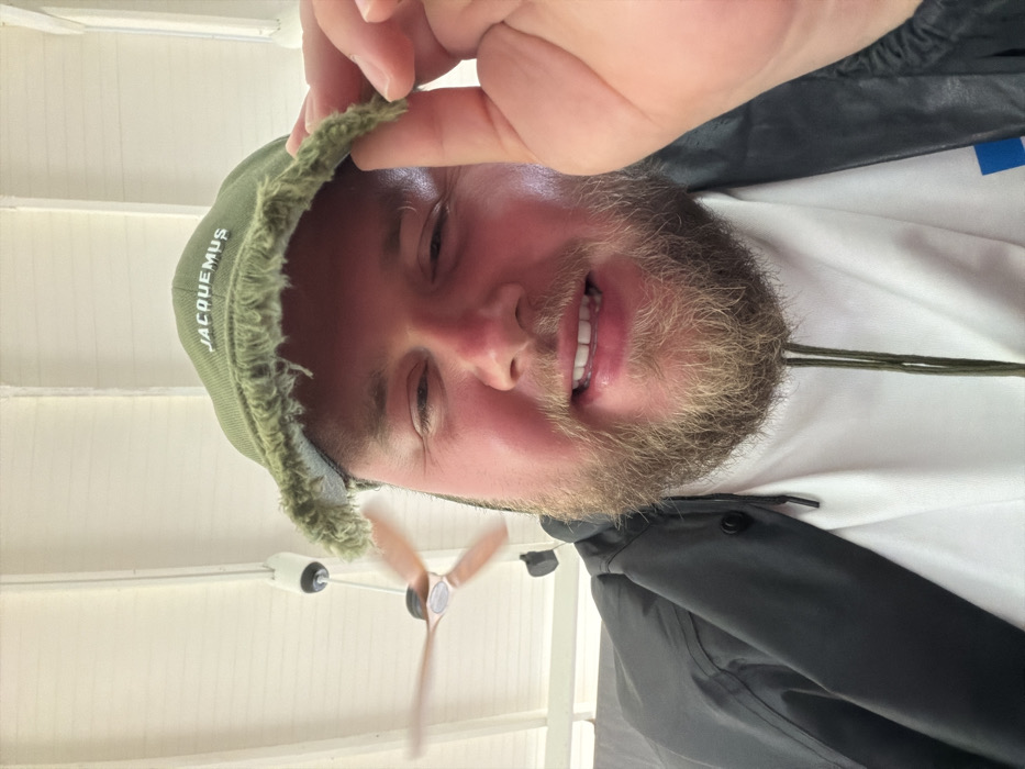 A fair-skinned male with a full reddish-brown beard and flushed cheeks looks directly at the camera, exhibiting a slight smile. He wears an olive green hat with a frayed brim, featuring "JACQUEMUS" embroidered in white. His left hand holds and slightly lifts the front brim of the hat. He is dressed in a dark grey or black jacket over a white t-shirt, with visible dark green drawstrings on the jacket. The background reveals a light-colored paneled ceiling with a wooden-bladed ceiling fan in motion in the upper left. The scene is located in Gulhi Falhu, Maldives.