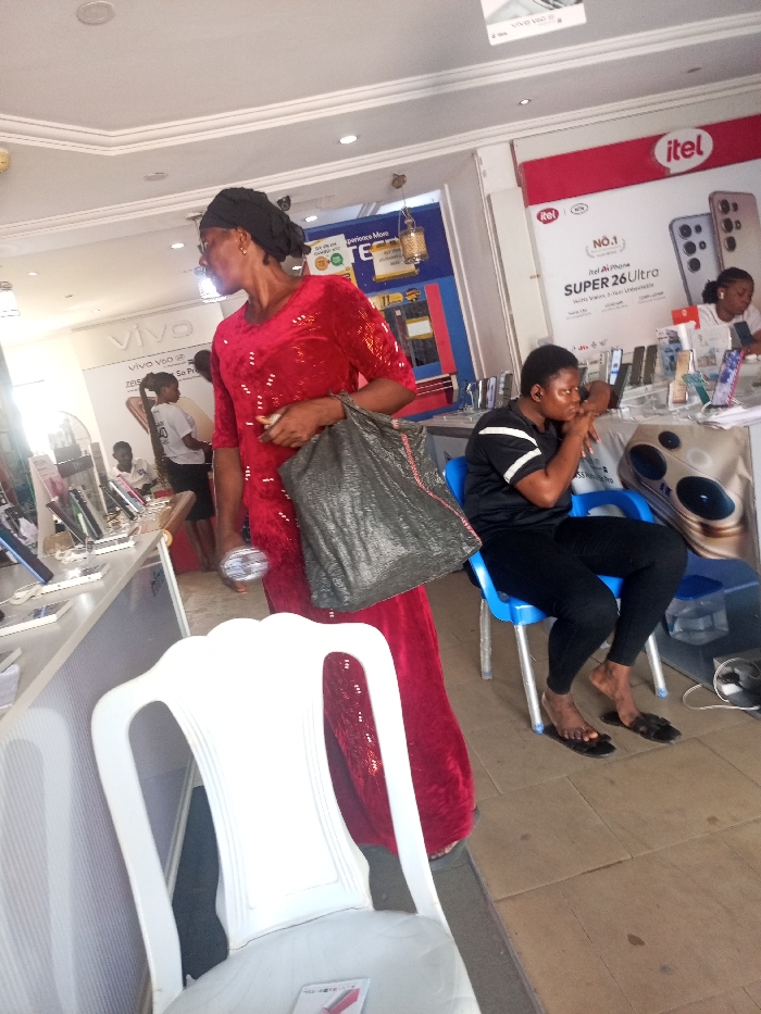 The image captures an interior view of a mobile phone retail store in Lokoja, Nigeria. In the foreground, a dark-skinned adult female stands, oriented towards the left. She wears a long, red, short-sleeved dress with a sparkling texture, a black headwrap, and hoop earrings. She carries a dark grey woven plastic bag over her left shoulder and holds a small, clear cylindrical object in her right hand. To her right, in the mid-ground, a second dark-skinned adult female is seated on a light blue plastic chair. She is dressed in a black t-shirt with two white horizontal stripes on the sleeves, black trousers, and black slide sandals with fluffy straps. She leans forward with her right hand near her mouth, looking to her right. A white plastic chair is partially visible in the immediate lower-left foreground, facing away. The store's interior features white display counters populated with numerous smartphones and tablets. Branding on the left wall prominently displays "VIVO," with "VIVO V60" and "ZEISS" sub-branding. The right wall features "itel" branding, highlighting "itel SUPER 26 Ultra" and "NO.1" messaging. "TECNO" branding is also visible in the central background. Recessed lighting is integrated into the white ceiling. The floor is composed of light brown square tiles. Multiple other individuals are discernible in the background, some interacting with display phones, consistent with a retail environment. A black oscillating fan is partially visible on the far left. Decorative golden hanging lanterns are present in the mid-background.