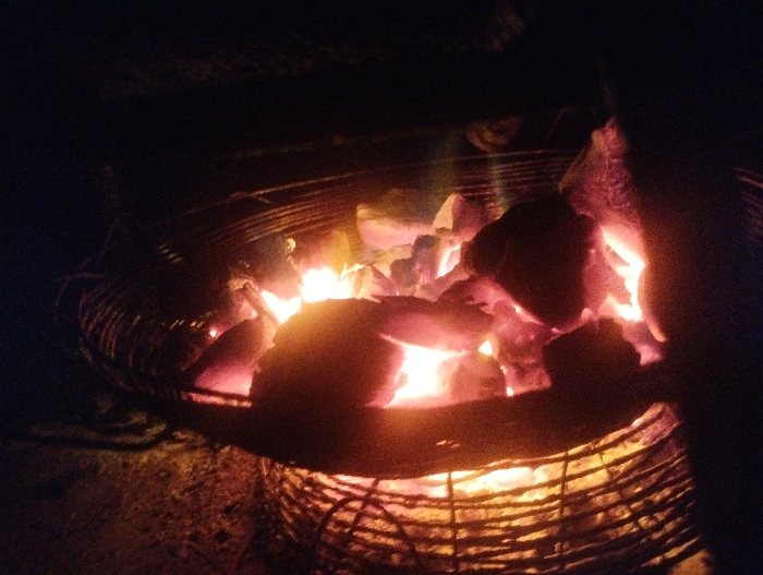 The scene depicts a burning charcoal fire contained within a cylindrical, woven wire or metal mesh structure, indicative of a brazier or stove