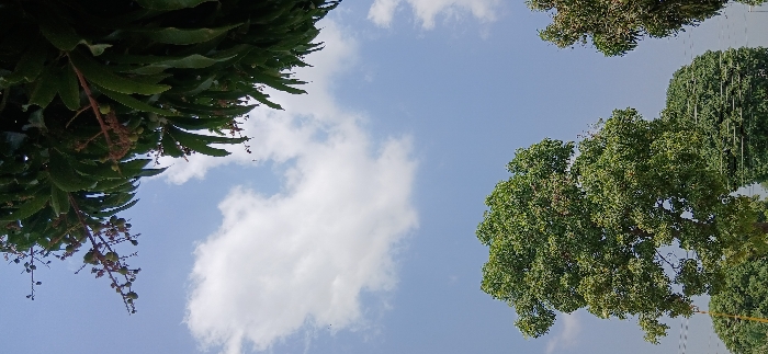 The image captures an outdoor daytime scene in Shaba, Nigeria. The upper two-thirds of the frame display a light blue sky with scattered white cumulus clouds. Dark green foliage from a tree extends across the top edge, featuring branches laden with numerous small, green, roundish fruits or flower clusters. In the lower-left quadrant, a tall tree with dense, light green foliage dominates, its canopy reaching upwards. The top of another green-leafed tree is partially visible in the lower-right. Multiple thin, dark horizontal lines, consistent with utility wires, are faintly discernible in the lower-left and lower-center areas, situated behind the trees. A segment of a yellow pole is present at the extreme bottom-left corner. No individuals or specific actions are present.