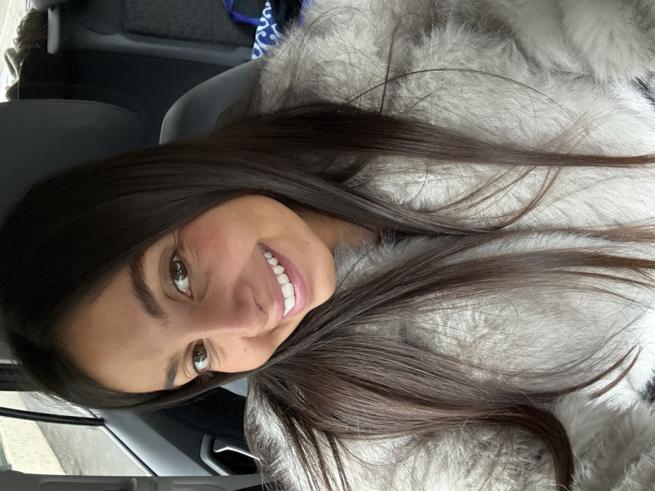 A forensic description of the scene depicts a female individual seated within the interior of a vehicle in Antibes, France. The subject, positioned centrally, presents a head-and-shoulders view. She possesses long, straight, dark brown hair that extends over her shoulders, light brown eyes, and visible freckles across her nose and cheeks. Her expression is a smile, exposing upper and lower teeth. She is attired in a light gray or off-white garment with a textured, fluffy, faux fur appearance. The immediate background details include dark-colored car interior elements: a headrest is visible behind her right shoulder, and a portion of a car door panel with a handle or armrest is seen behind her left. A blurred window on the left side shows a diffused, indistinct outdoor environment, consistent with an overcast or possibly rainy daytime. To the upper right, a segment of a blue and white patterned item, possibly a bag or fabric, is discernible on the vehicle's rear seat.